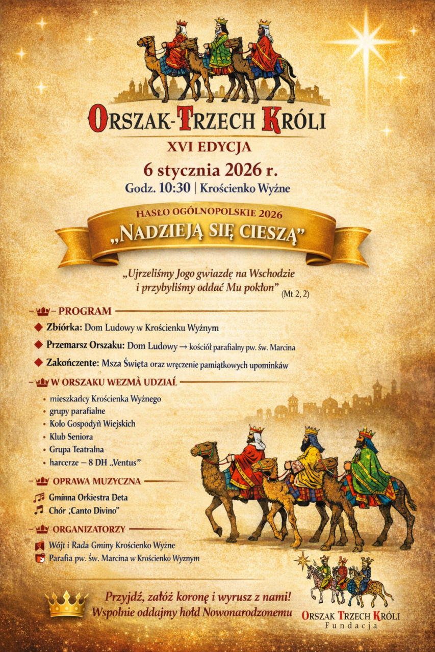 Już dzisiaj zapowiadam i zapraszam do wzięcia udziału w 16 – Orszaku Trzech Mędrców. Zapraszamy wszystkich ludzi dobrej woli. Harcerzy ze skrzydłami anielskimi, grupę teatralna z naszej szkoły, panie z Klubu Seniora i KGW, strażaków – Młodzieżową Drużynę Pożarniczą, uczniów naszej szkoły i naszych przedszkoli, naszą Orkiestrę Gminną, grupy parafialne: chór, Odnowę w Duchu Świętym, Kręgi Dobowego Kościoła, KSM, Ministrantów i lektorów, scholę, Rady Parafialne wszystkich dla których ta uroczystość Trzech Króli i orszak jest ważny. Już teraz pomyślmy o strojach aby włączyć się w ten Orszak- jak co roku będzie pod patronatem Ogólnopolskiego Orszaku Trzech Króli i Wójta i Rady Naszej Gminy.
