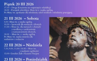 Plan Rekolekcji Wielkopostnych – Krościenko Wyżne 20 III – 23 III 2026 Rekolekcjonista – Ks. Wiktor Kowalski Piątek 20 III 2026 – 17.30 – Droga Krzyżowa 18.00 -Początek rekolekcji. Msza św z Nauką Ogólną. Po Mszy św. spotkanie dla młodzieży szkól średnich i młodzieży pracującej. 21 III 2026 – Sobota 8.00- Msza św z nauka ogólną 10.30 – [...]